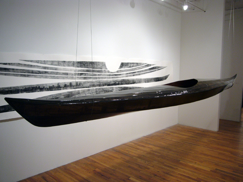 The entire surface of the boat is carved with images of the skyline seen from the East River. Before I constructed the boat, I printed the planks with a steam roller. See pictures of the process.